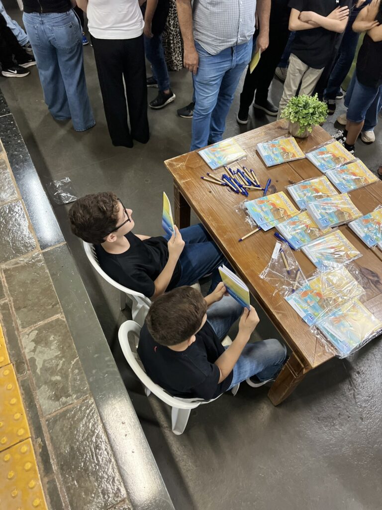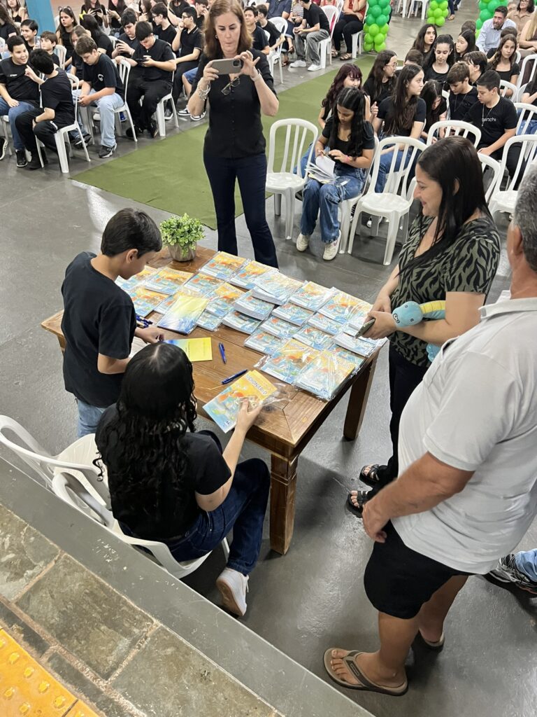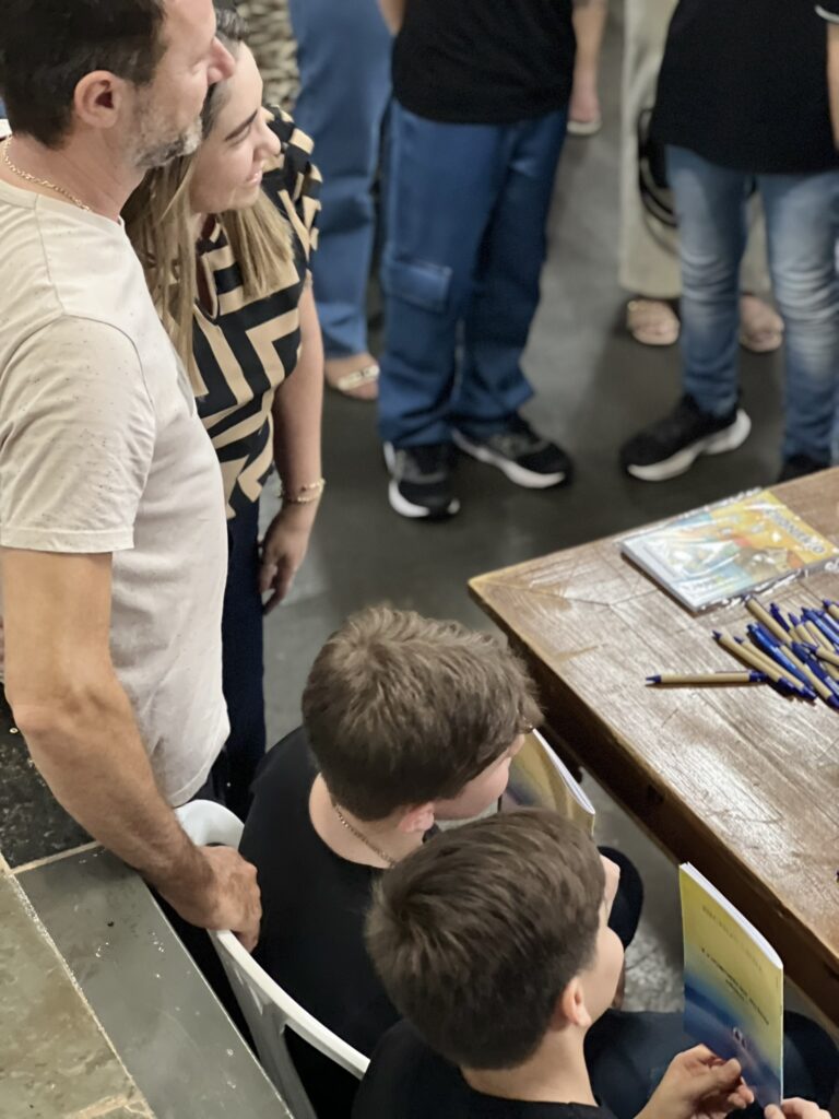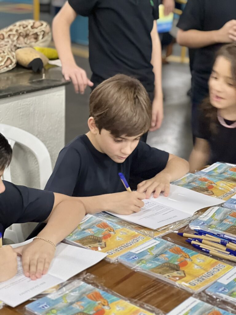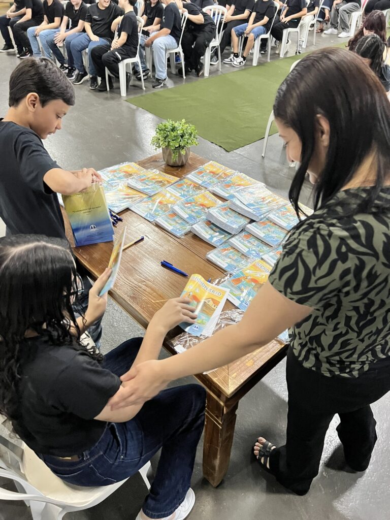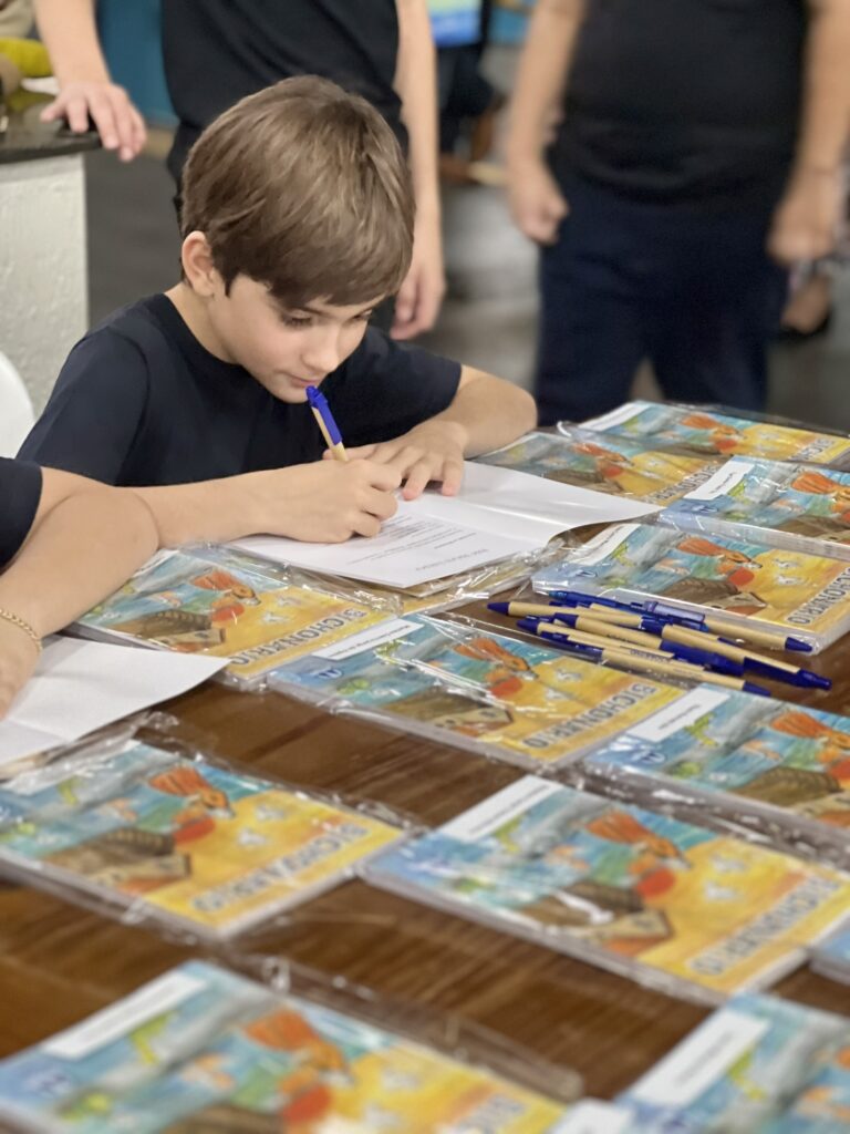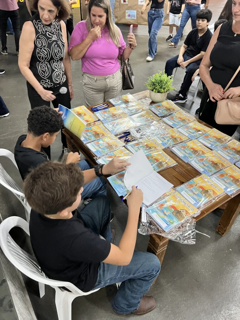 Cada criança autografou seu próprio exemplar, vivendo a experiência de ser autora e protagonista do próprio aprendizado. Foi uma noite cheia de orgulho, sorrisos e fantasia! 💙✍️