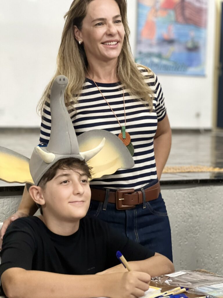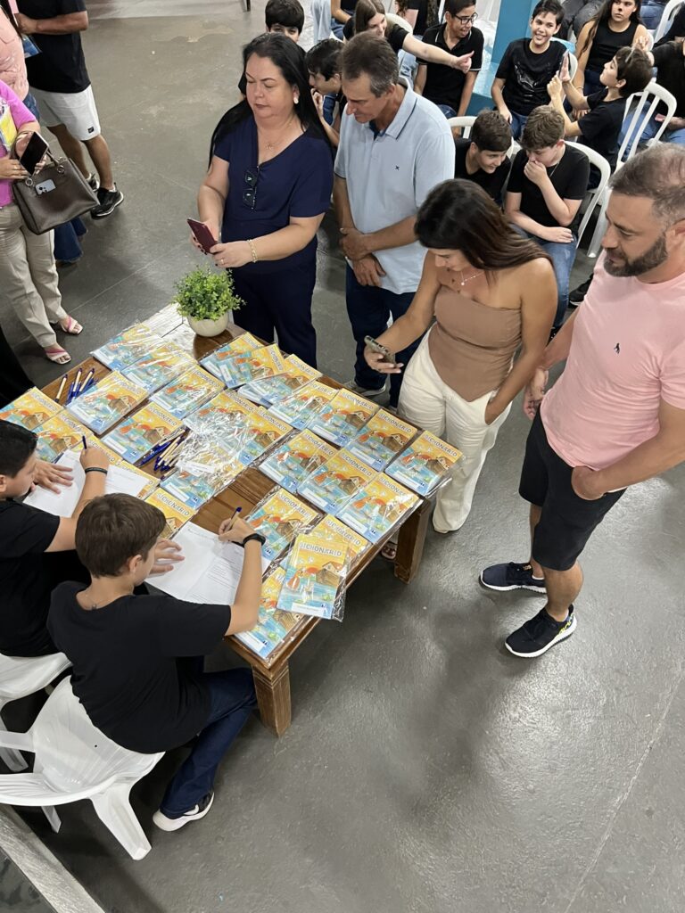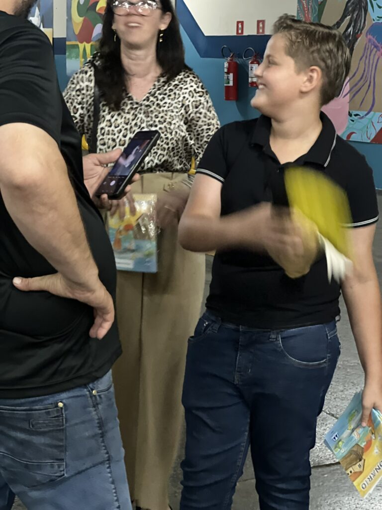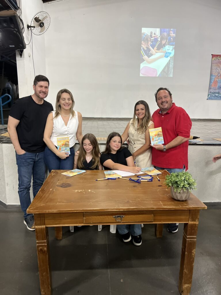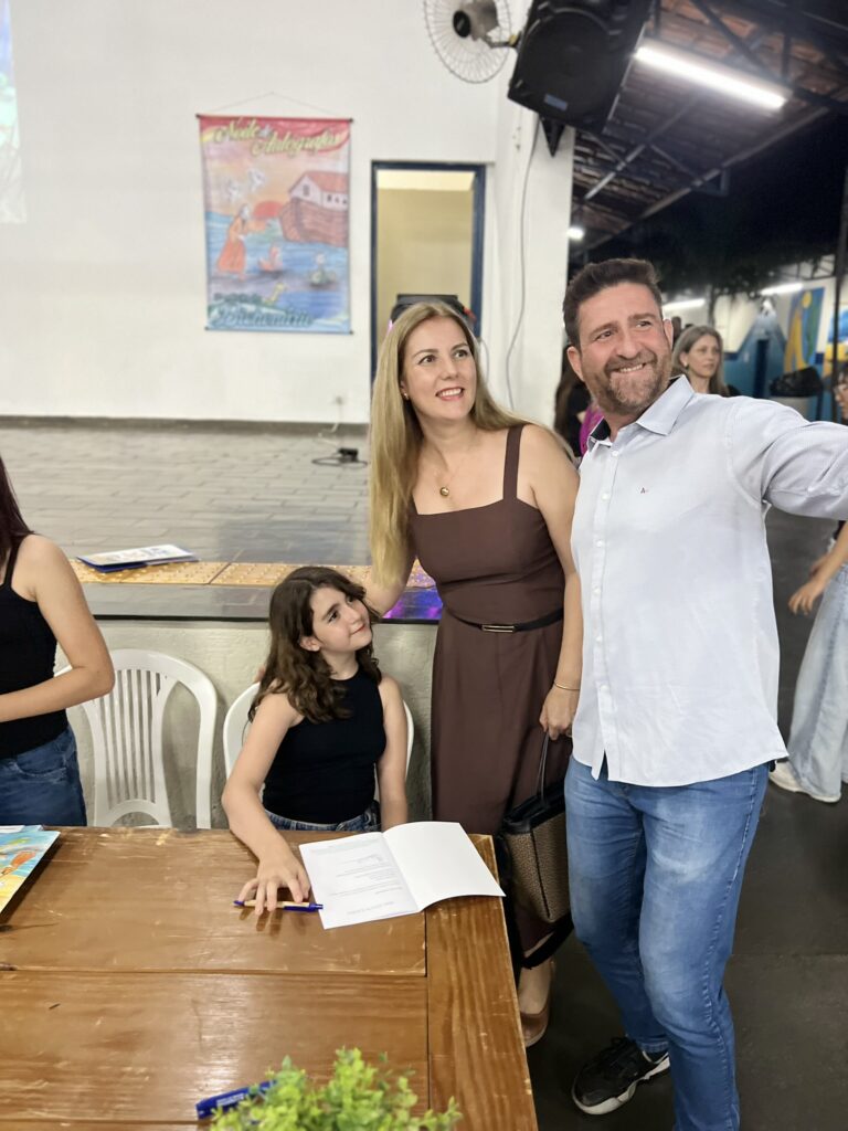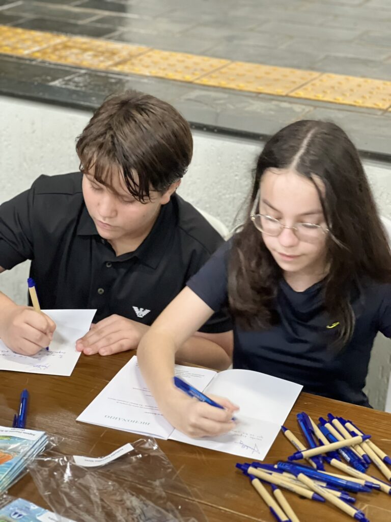 Cada criança autografou seu próprio exemplar, vivendo a experiência de ser autora e protagonista do próprio aprendizado. Foi uma noite cheia de orgulho, sorrisos e fantasia! 💙✍️