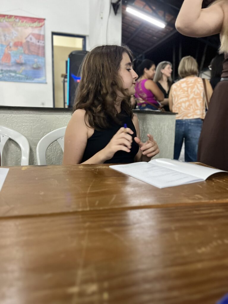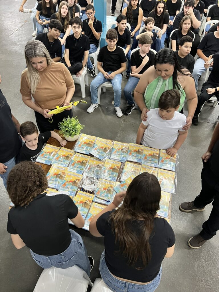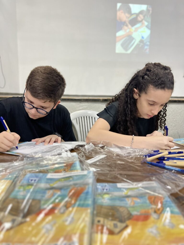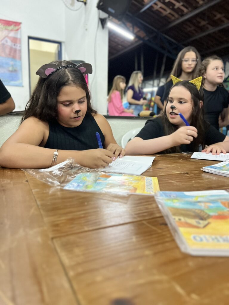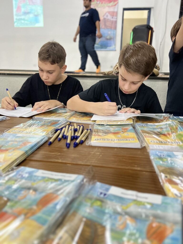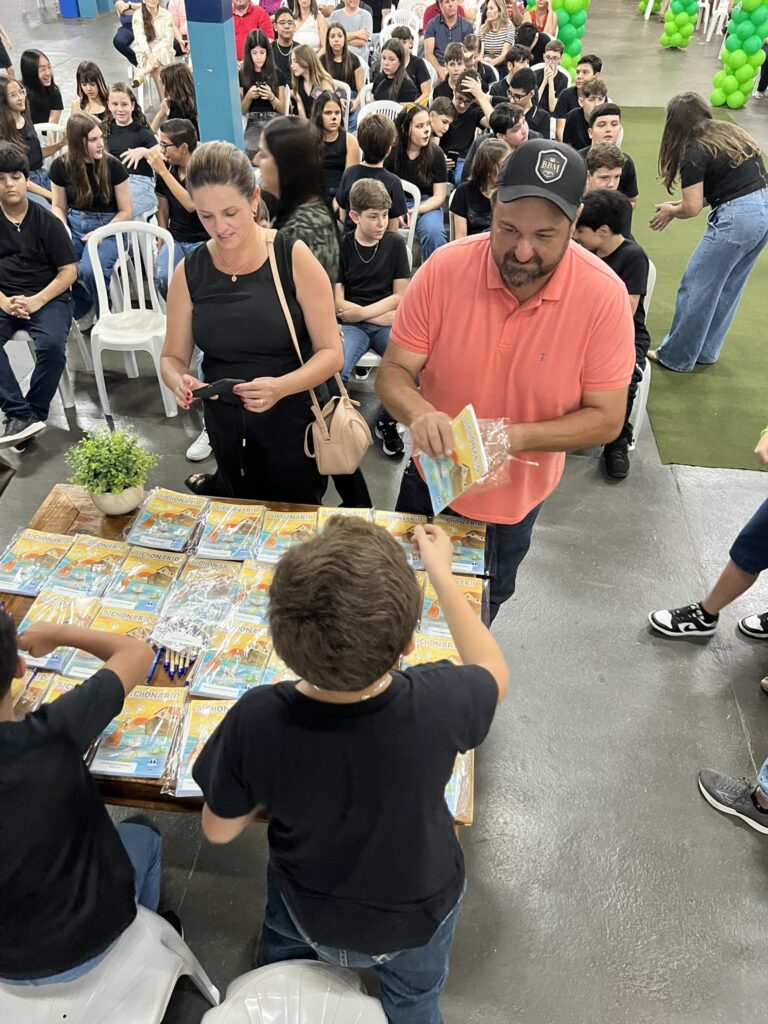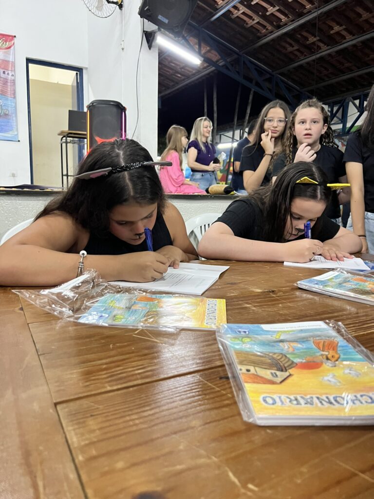 Cada criança autografou seu próprio exemplar, vivendo a experiência de ser autora e protagonista do próprio aprendizado. Foi uma noite cheia de orgulho, sorrisos e fantasia! 💙✍️