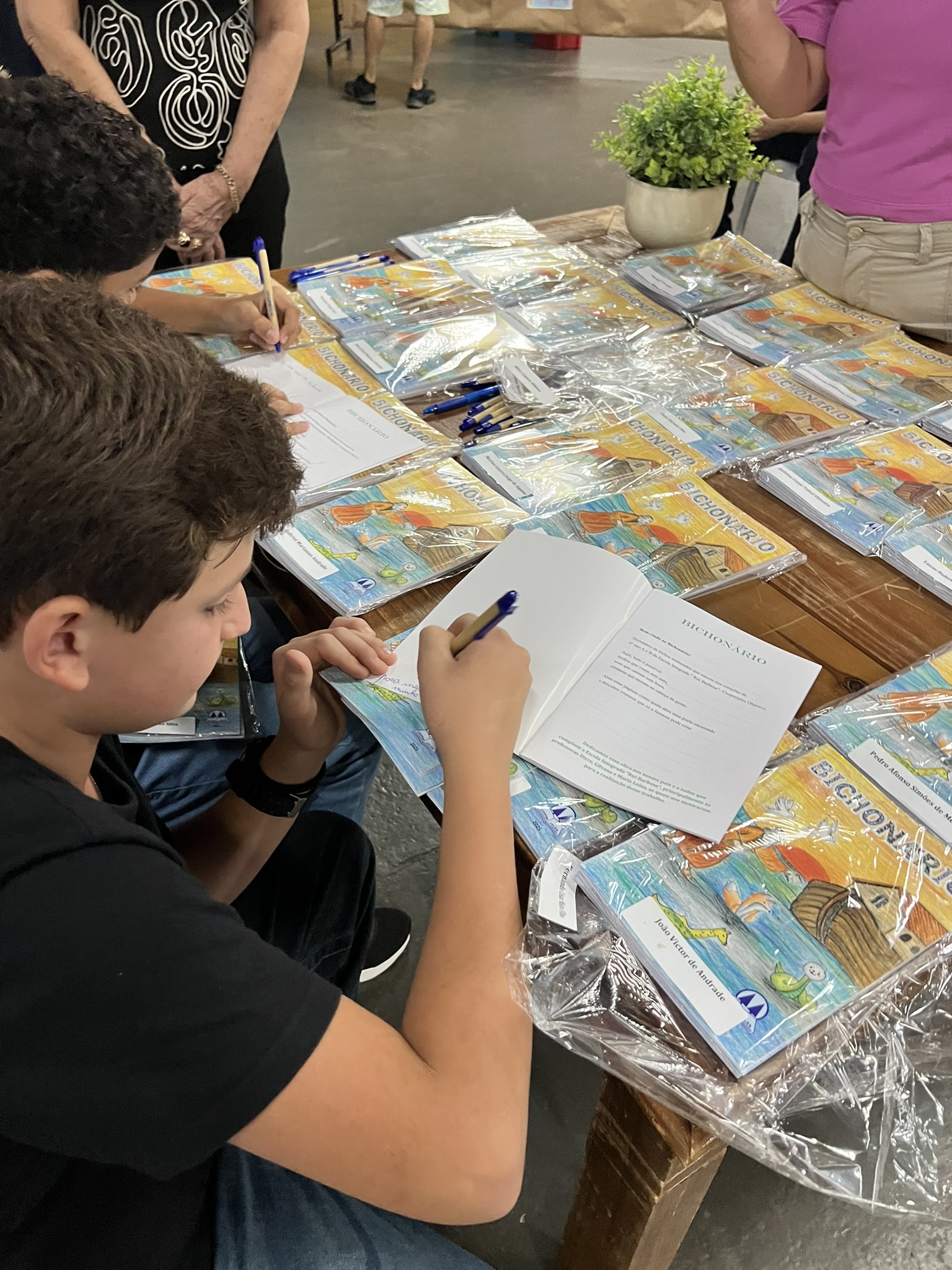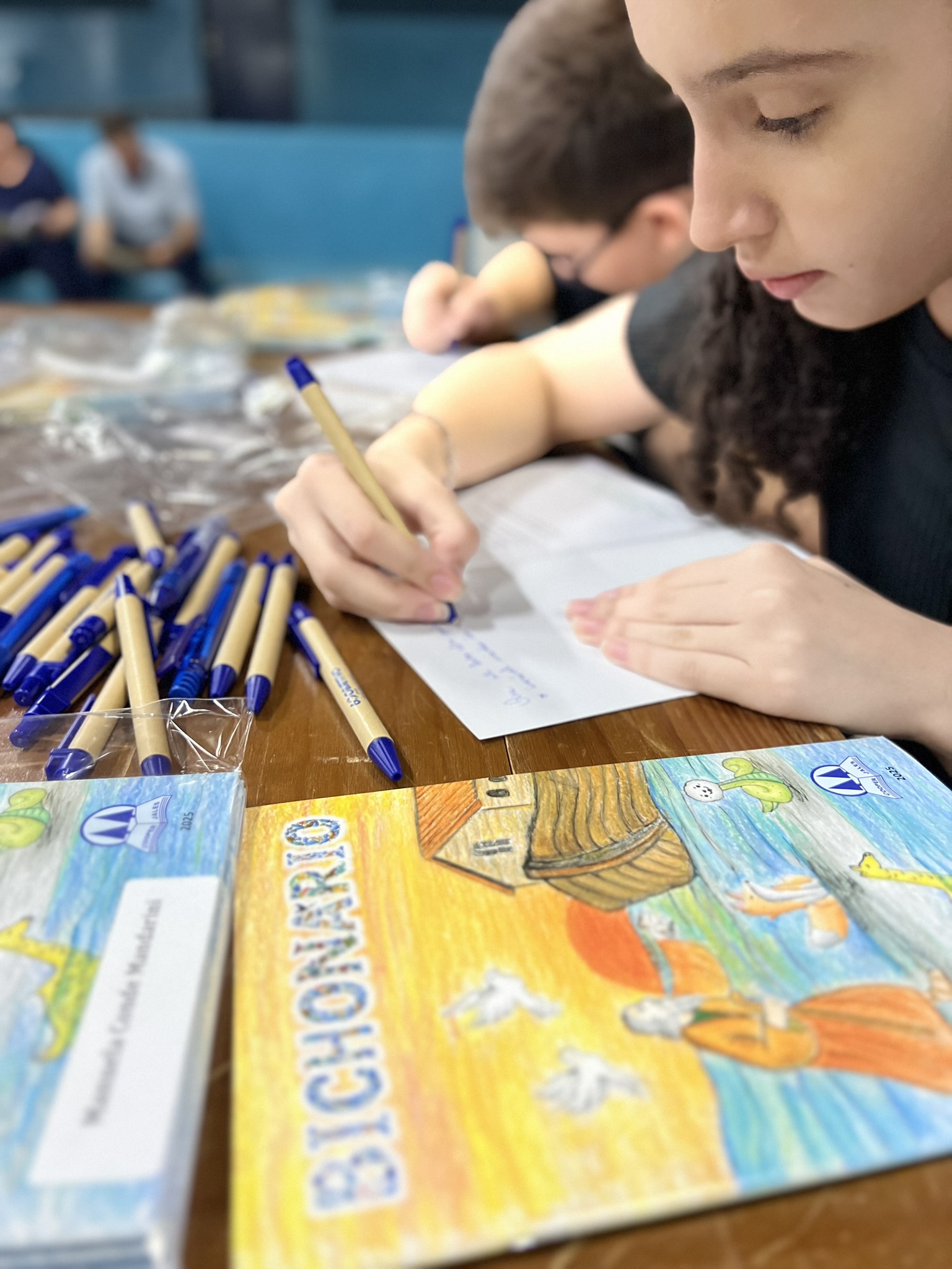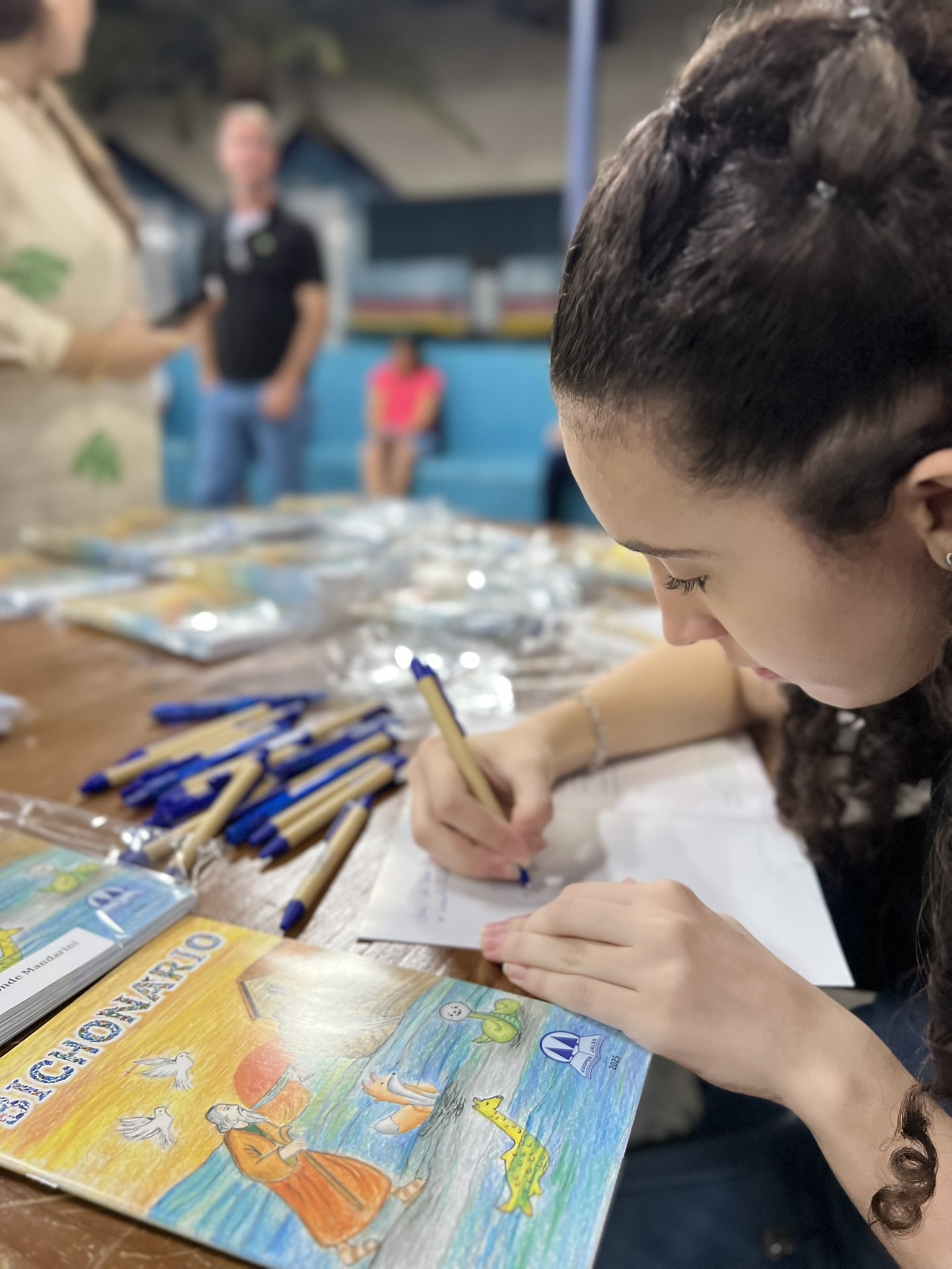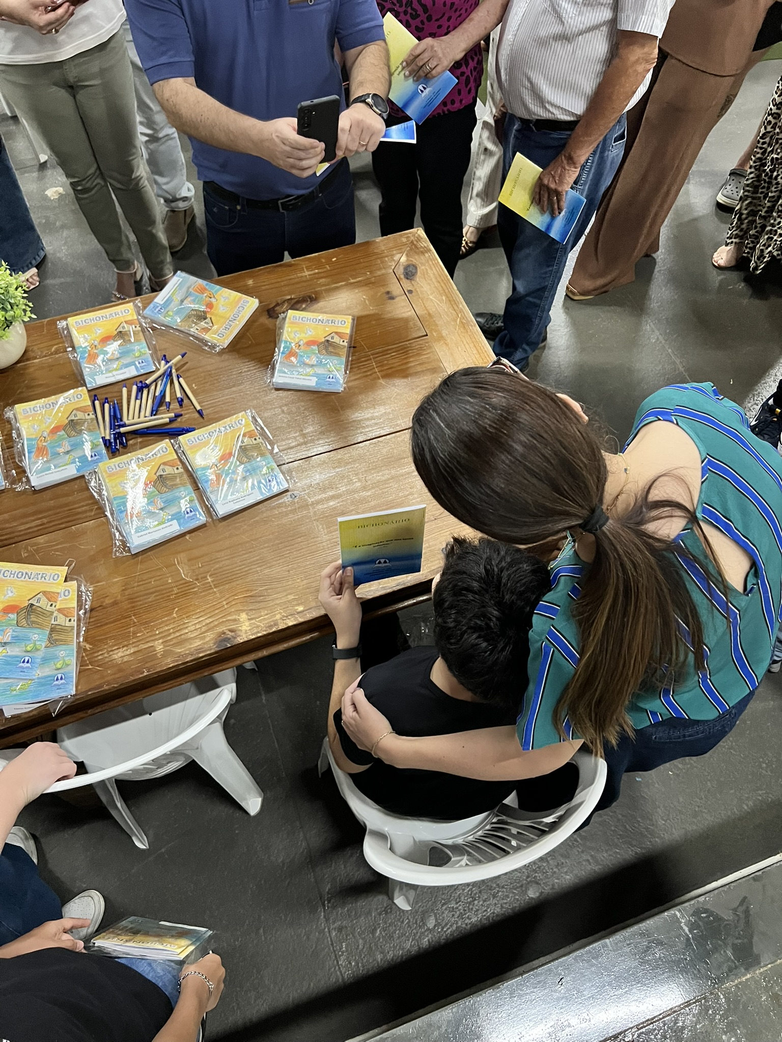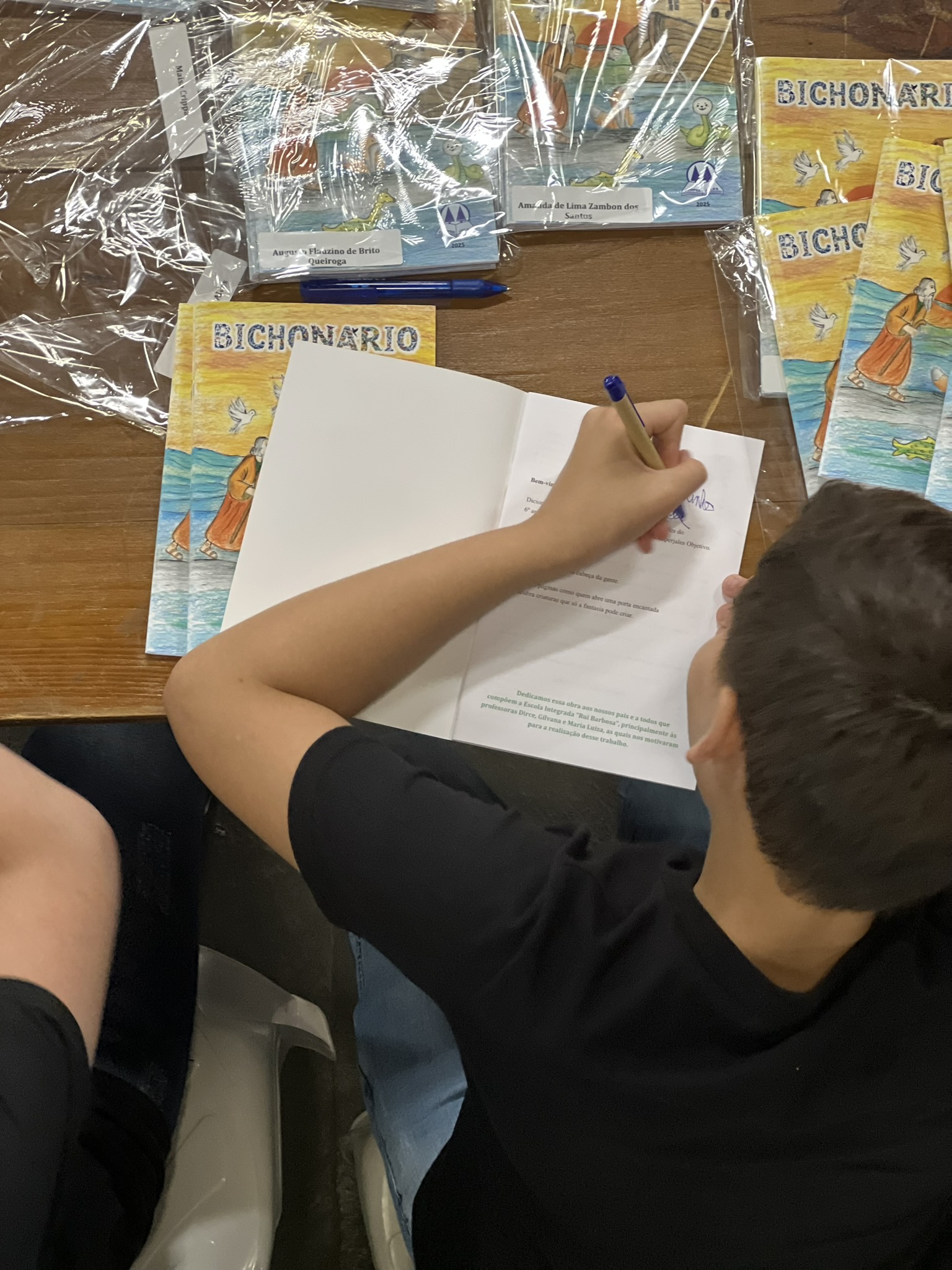Cada criança autografou seu próprio exemplar, vivendo a experiência de ser autora e protagonista do próprio aprendizado. Foi uma noite cheia de orgulho, sorrisos e fantasia! 💙✍️