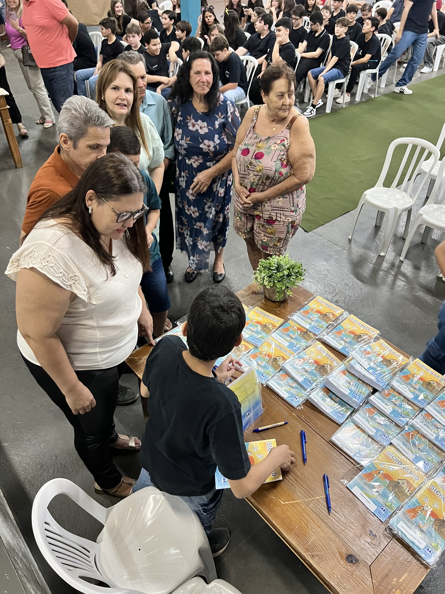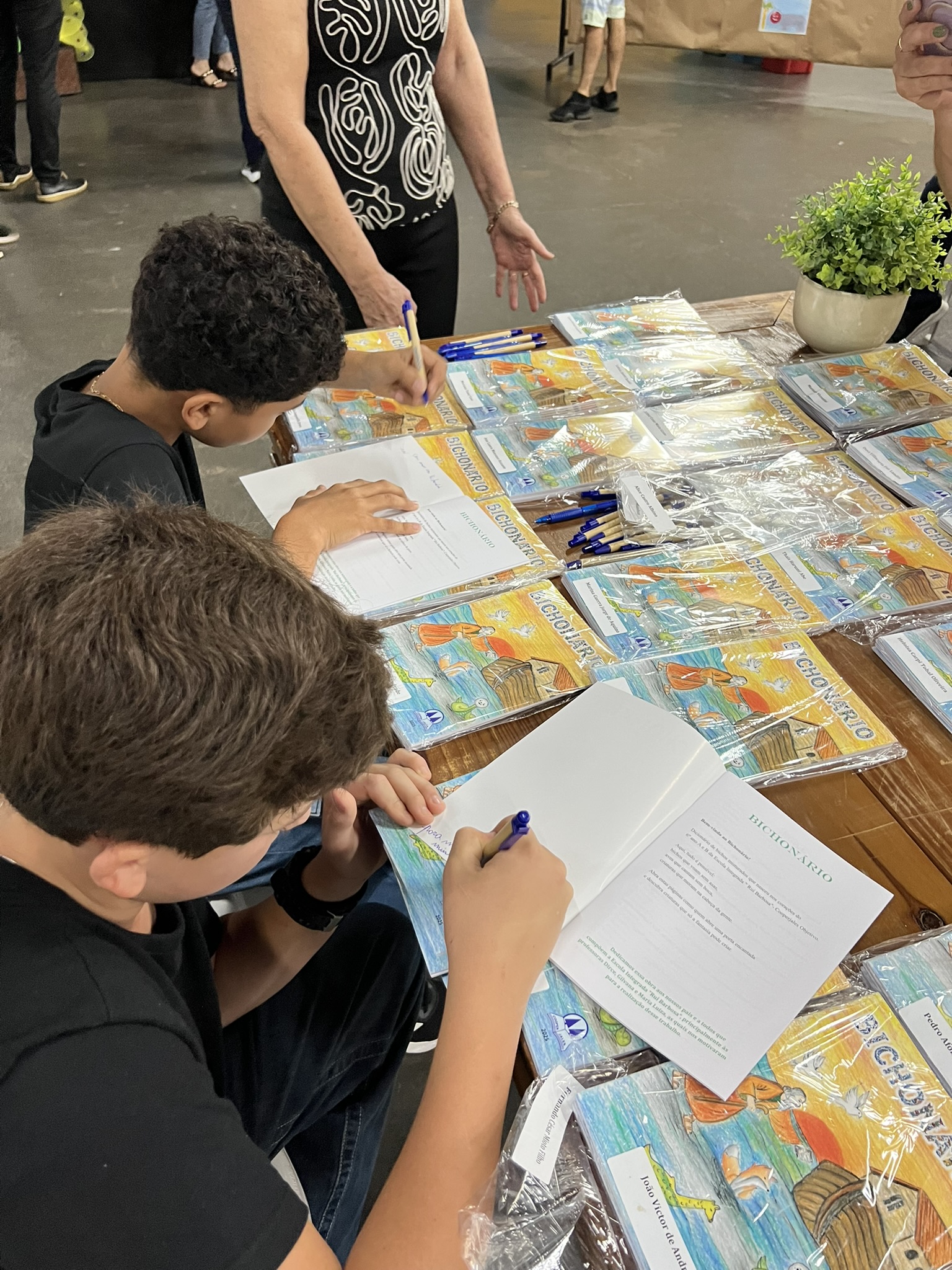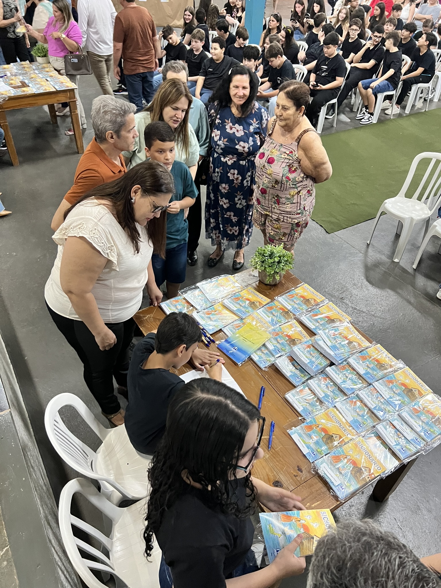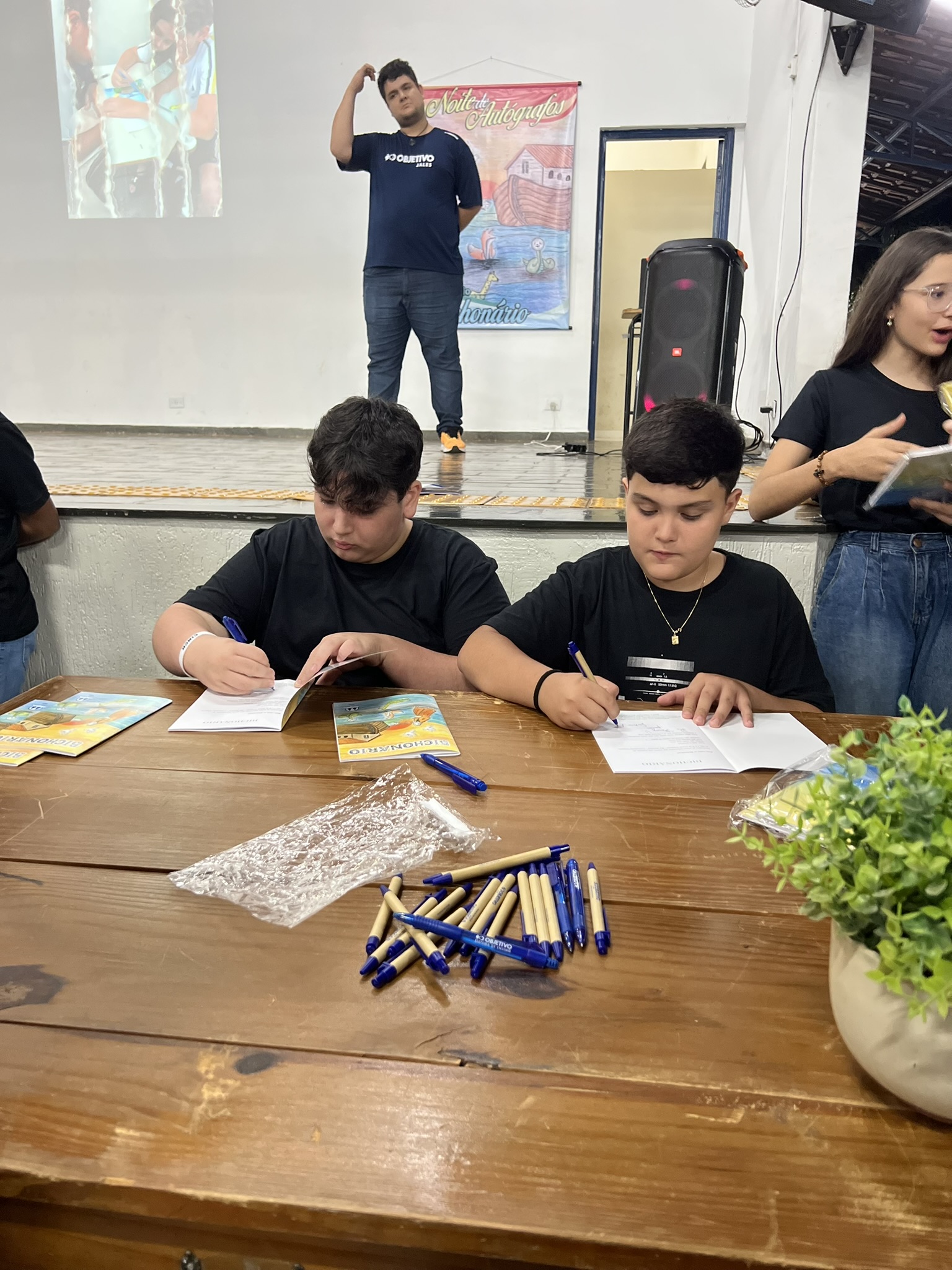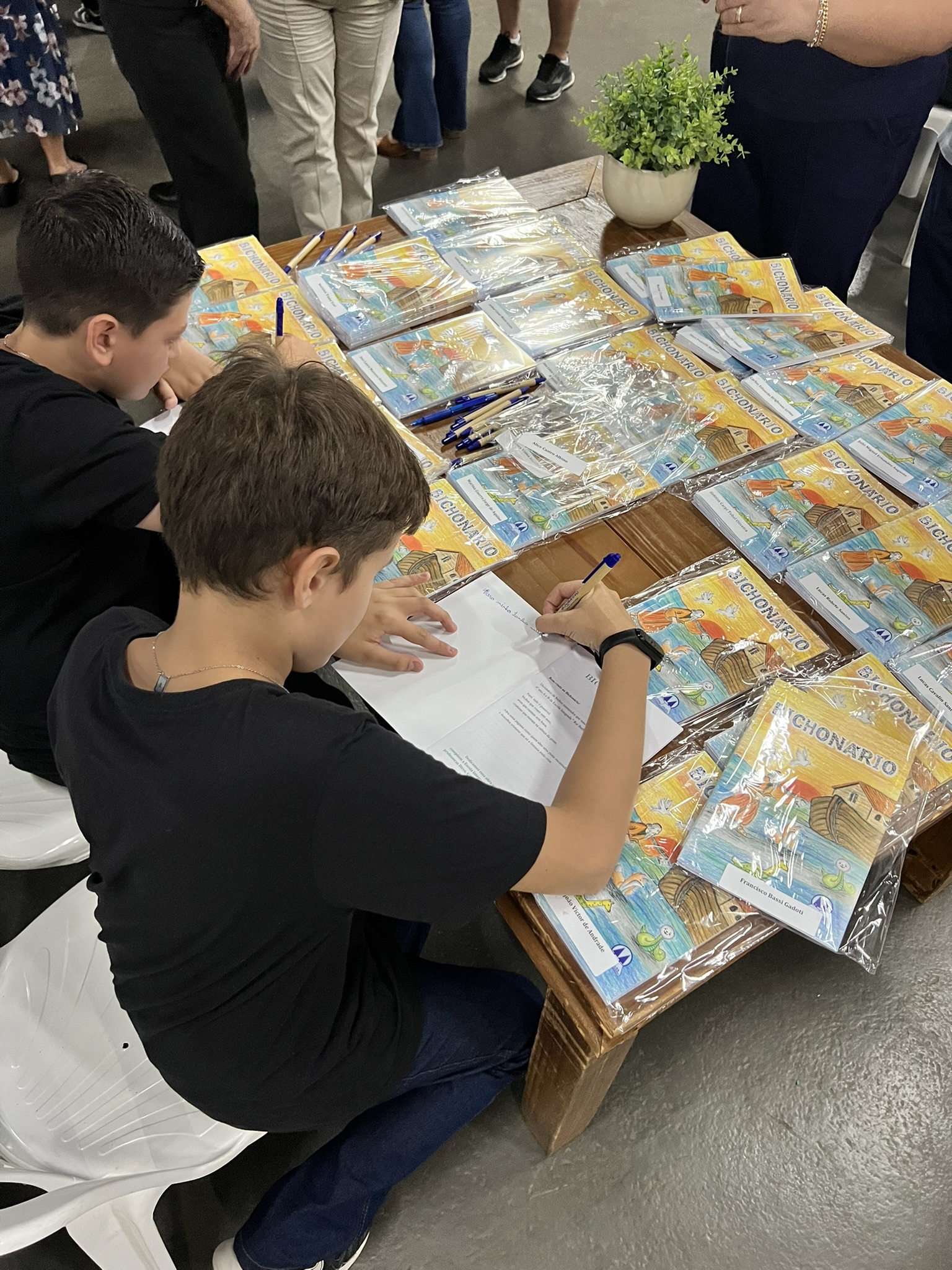 Cada criança autografou seu próprio exemplar, vivendo a experiência de ser autora e protagonista do próprio aprendizado. Foi uma noite cheia de orgulho, sorrisos e fantasia! 💙✍️